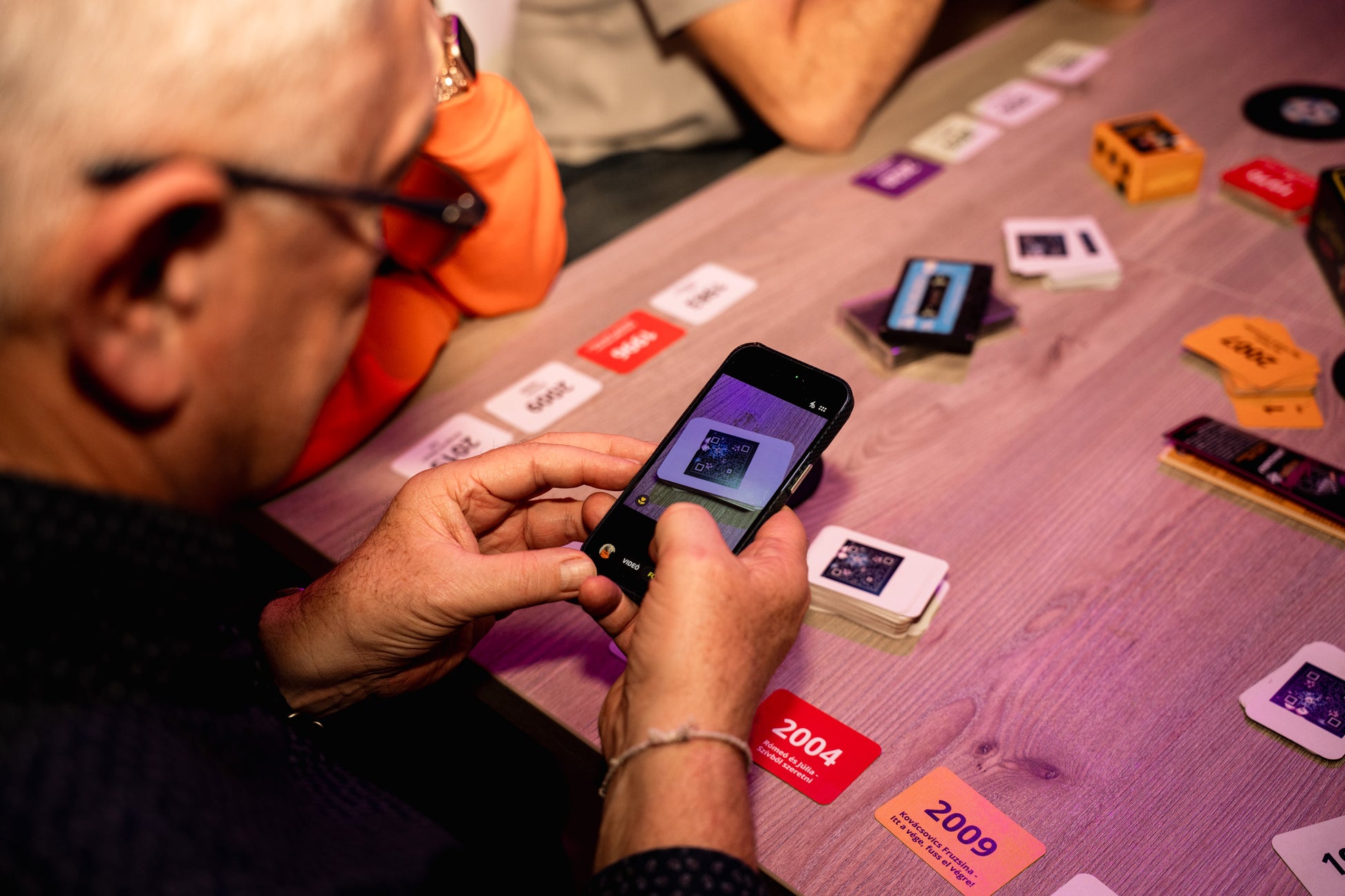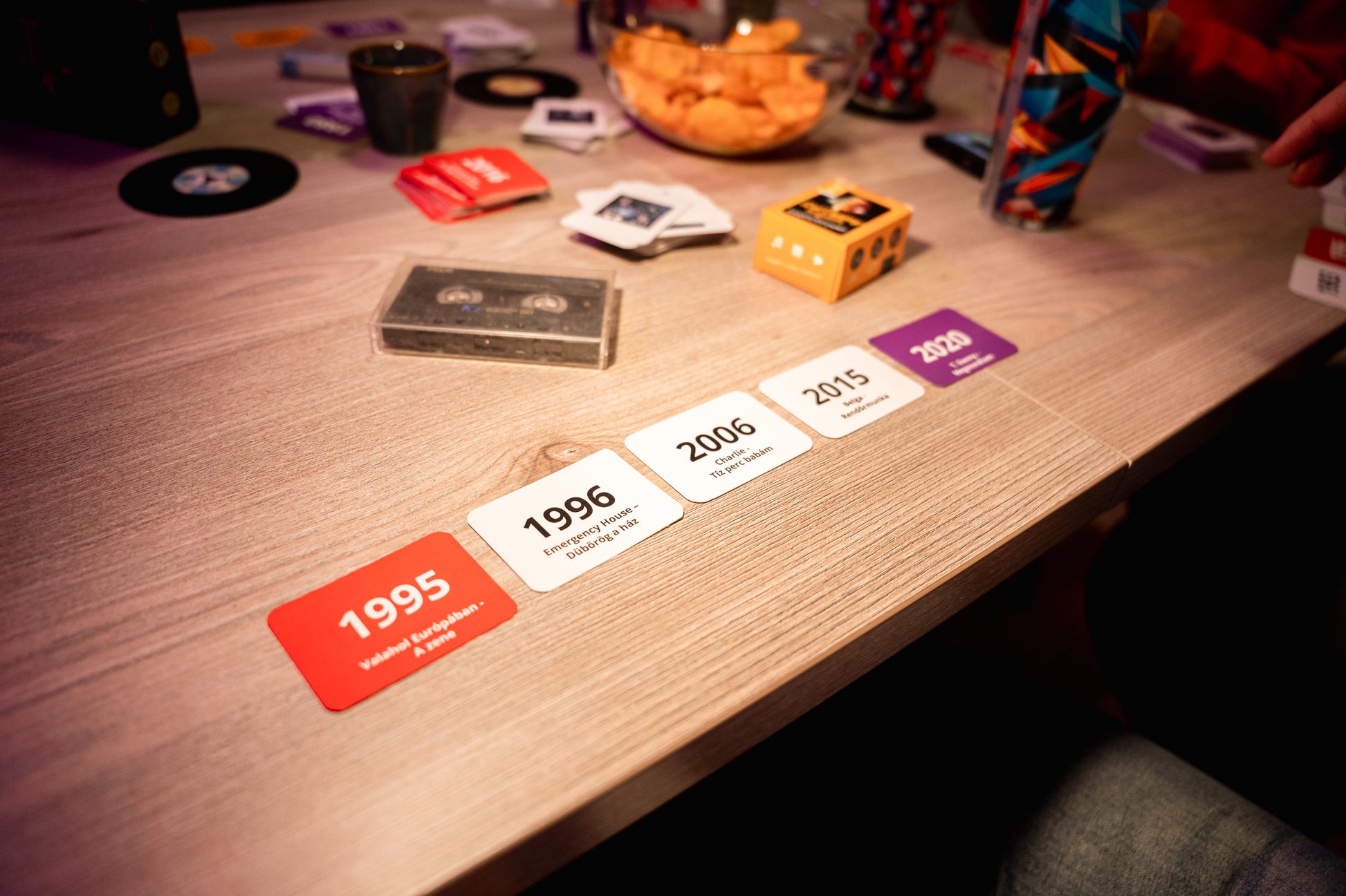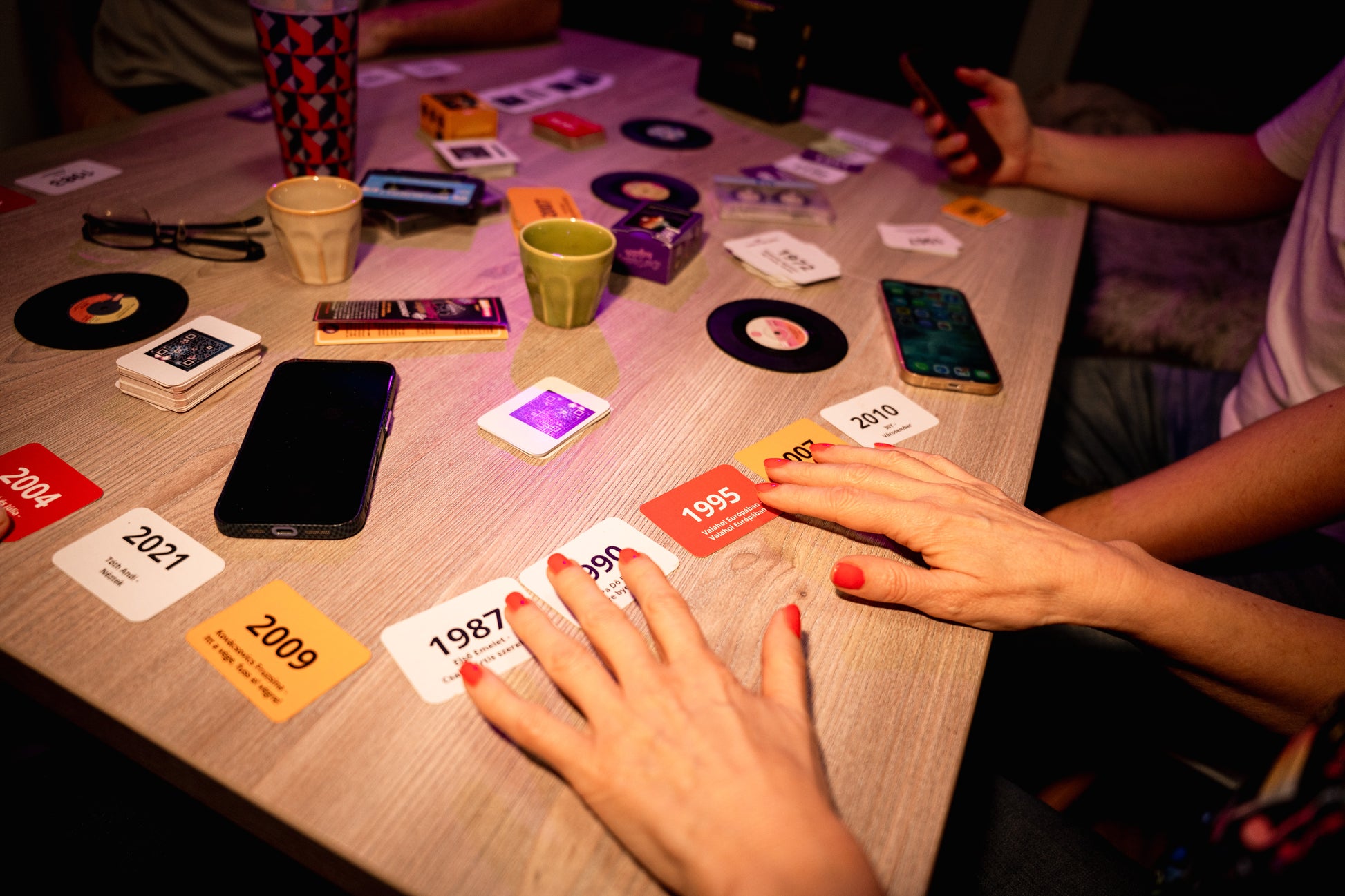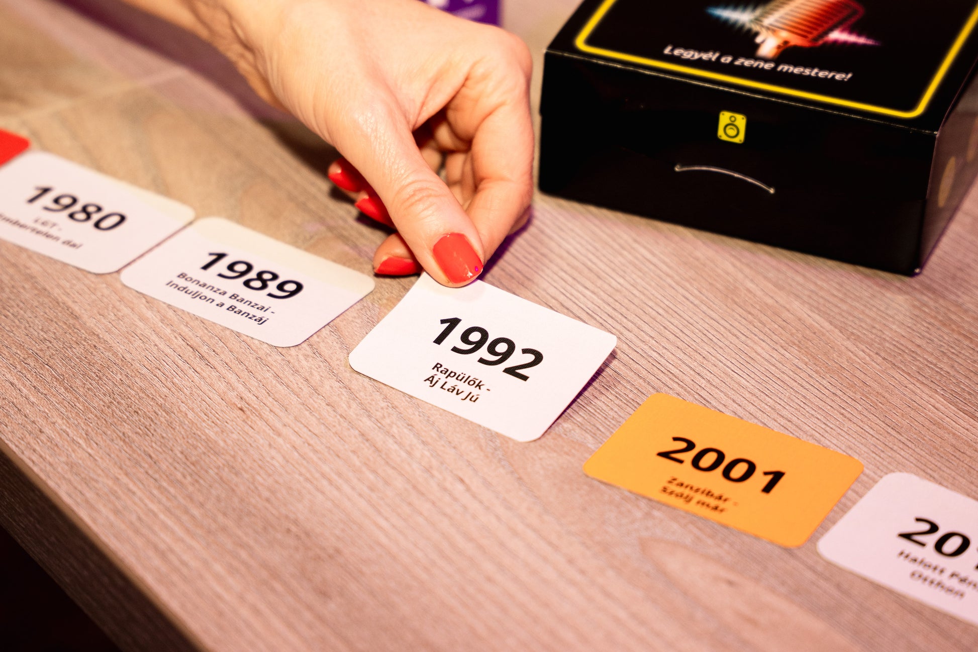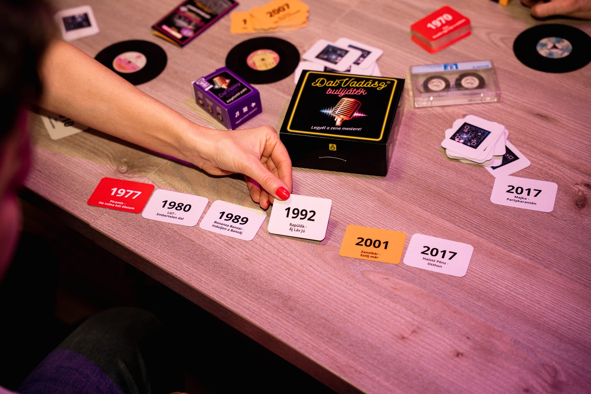A feladat egyszerű: QR-kód beolvasás → dalrészlet meghallgatása → a kártya elhelyezése a már lent lévő dalok idővonalán.
